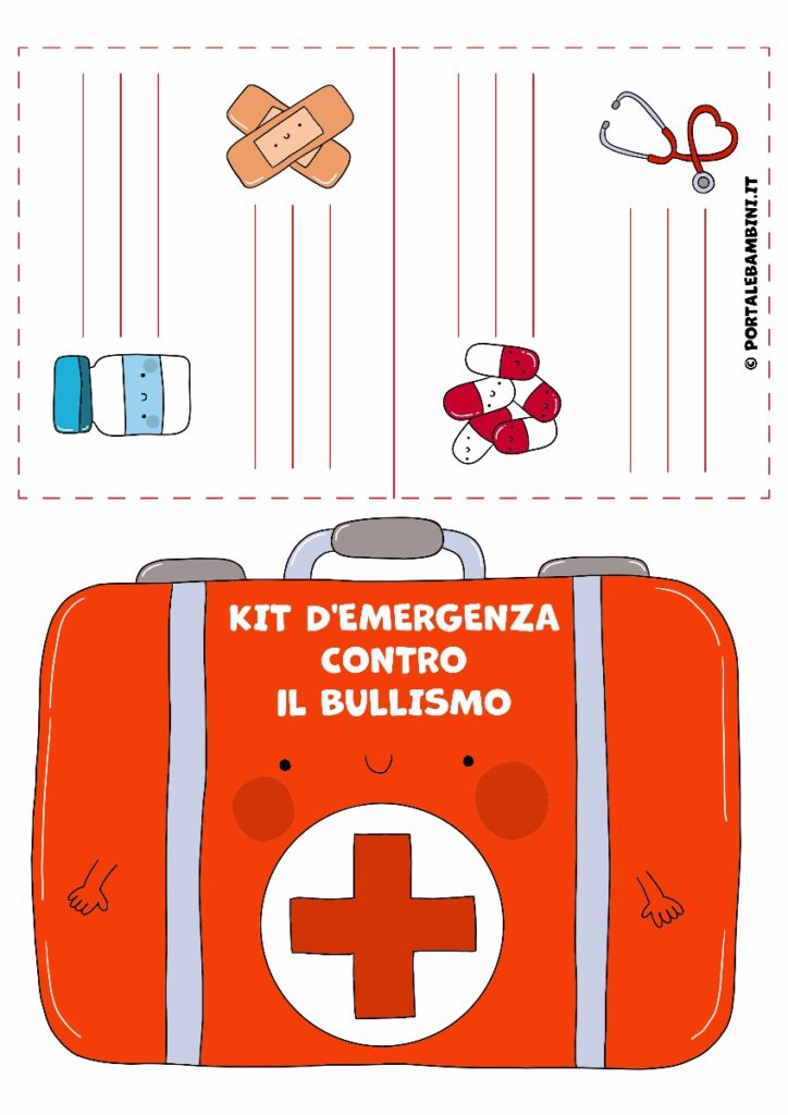 Per parlarne in classe abbiamo realizzato questo “Kit di emergenza contro il bullismo”: una valigetta all’interno della quale ogni bambino potrà suggerire, sinteticamente, 4 rimedi per sconfiggerlo.