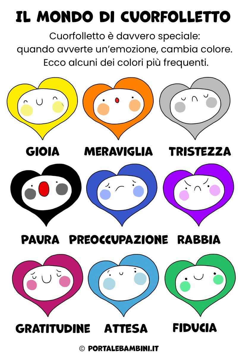 Il mood tracker è uno strumento, cartaceo o digitale, che aiuta a tenere traccia dell’umore nel tempo. In pratica, si annota come ci si sente ogni giorno per comprendere meglio i propri stati emotivi e ciò che li influenza. Di solito si sceglie un colore per rappresentare l’emozione predominante della giornata, ma potete anche decidere di colorare Cuorfolletto con più colori, se durante la giornata avete provato emozioni diverse (cosa che accade molto spesso!). In questo caso, all’interno di ogni Cuorfolletto, dovrete indicare la data del giorno corrispondente.