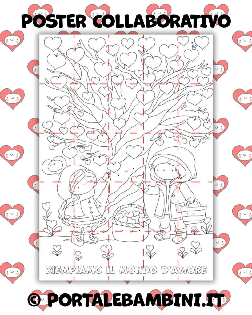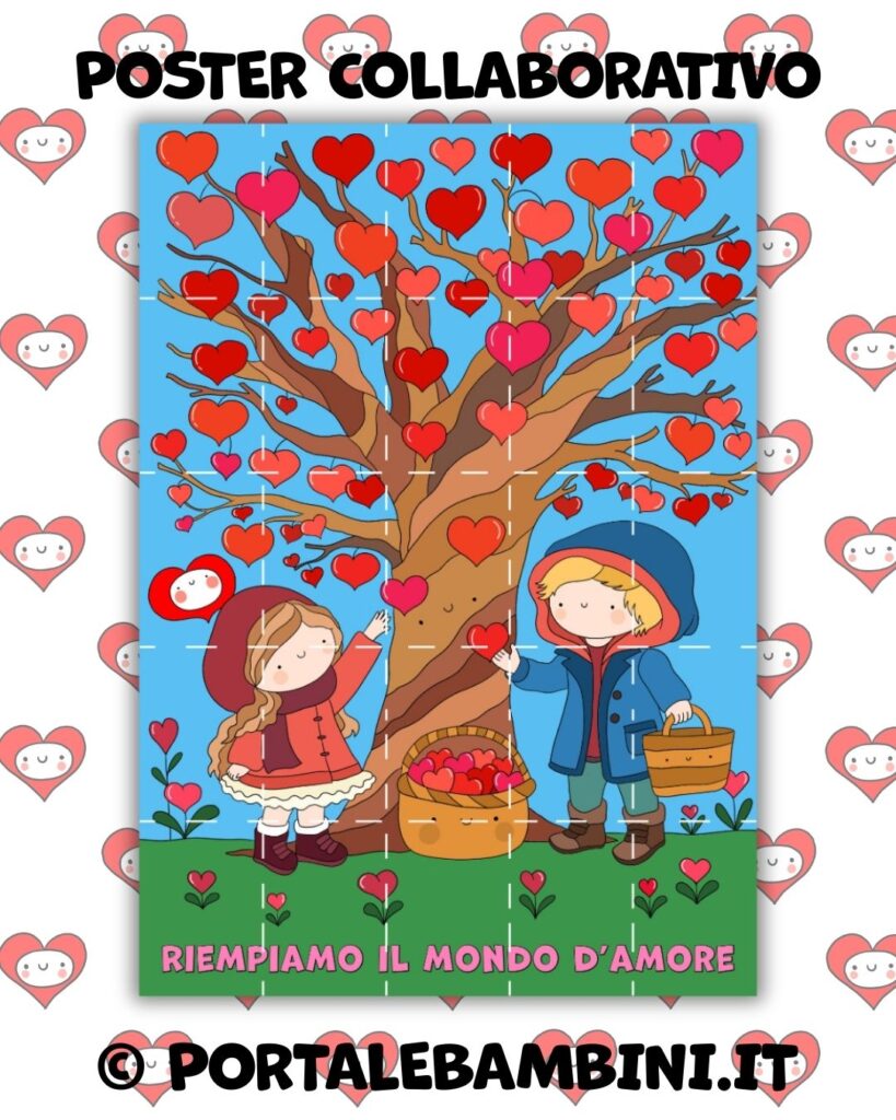 Poster collaborativo con laboratorio: Abbiamo progettato quest’attività per lavorare sul tema del rispetto e dell’amore con i bambini: si tratta di un poster collaborativo da stampare e realizzare tutti insieme. Successivamente, ogni bambino potrà realizzare il suo cuore e incollarlo all’albero per renderlo ancora più unico. Dentro il cuore potrà scrivere una parola di luce o un breve pensiero sul tema del rispetto, trasformando l’albero in un prontuario di pensieri gentili da cui prendere esempio. I più piccoli, anziché scrivere, potranno disegnare all’interno del cuore una scena significativa di rispetto o gentilezza.