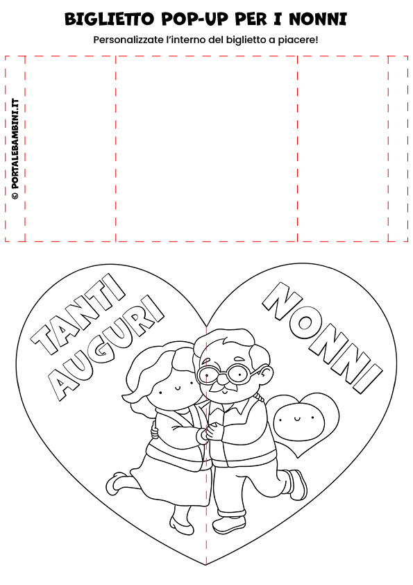 Un biglietto pop-up a forma di cuore con l’interno da personalizzare. Realizzarlo è semplicissimo: 1) colorate l’interno del cuore, 2) ritagliatelo e tagliatelo a metà seguendo la linea tratteggiata; 3) ritagliate la sagoma del biglietto e piegate le alette; 4) incollate le due metà del cuore sulle linguette situate all’esterno di ciascuna aletta. In questo modo, tirando le due metà del cuore sarà possibile rivelare l’interno del biglietto. È più semplice a farsi che a dirsi!