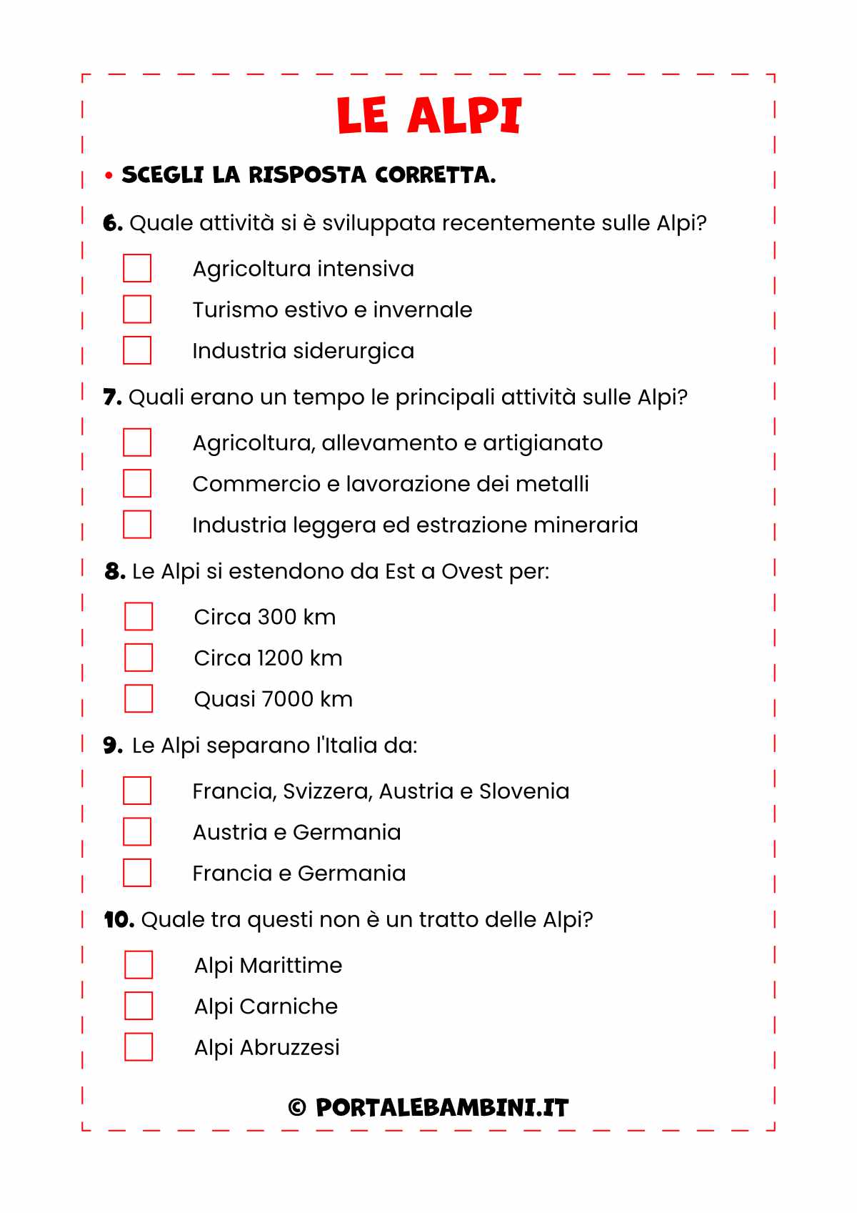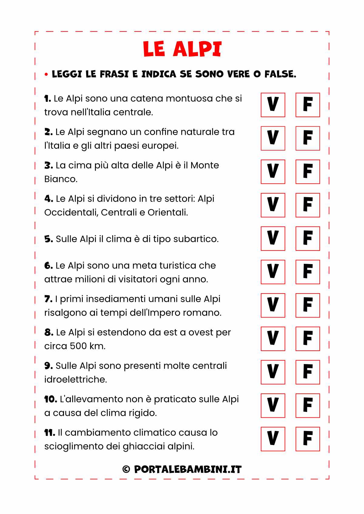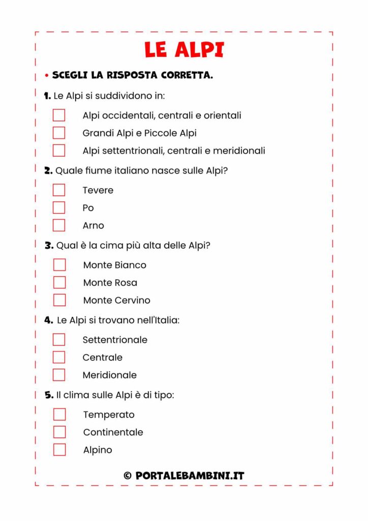 Qui sotto potete trovare alcune schede di esercitazione sulle Alpi per i bambini della scuola primaria (potete usarle anche come verifiche). Cliccate su ciascuna scheda per stamparla.
