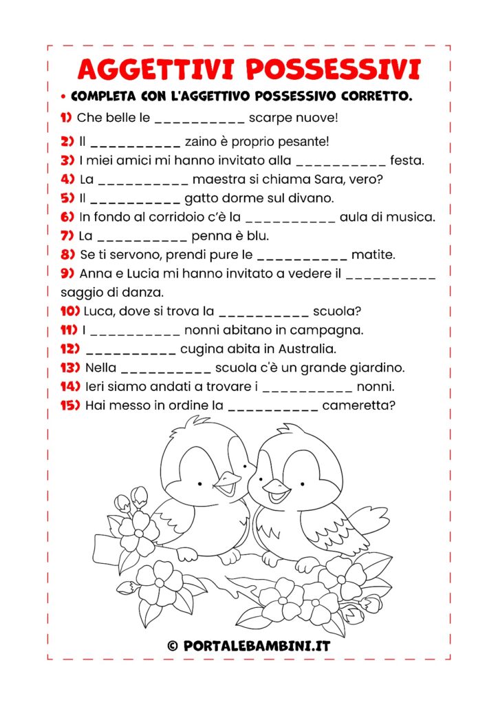 Nella prima scheda i bambini dovranno completare le frasi con l’aggettivo possessivo corretto; nella seconda, invece, dovranno riuscire a discriminare aggettivi e pronomi possessivi.