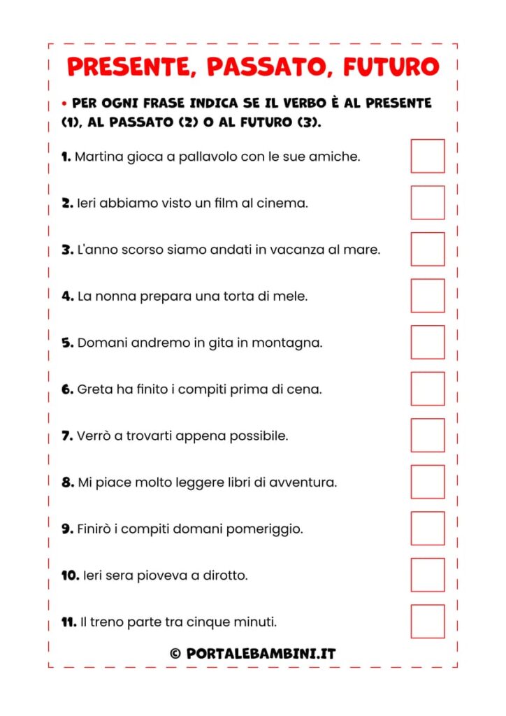 In questa scheda i bambini dovranno leggere delle brevi frasi e indicare se il verbo indica un’azione che si svolge nel presente, nel passato o nel futuro contrassegnandoli con i numeri 1, 2 e 3.