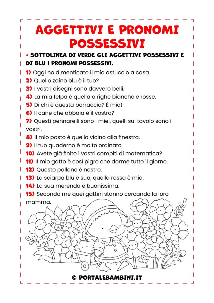 Nella prima scheda i bambini dovranno completare le frasi con il pronome possessivo corretto; nella seconda, invece, dovranno riuscire a discriminare aggettivi e pronomi possessivi.