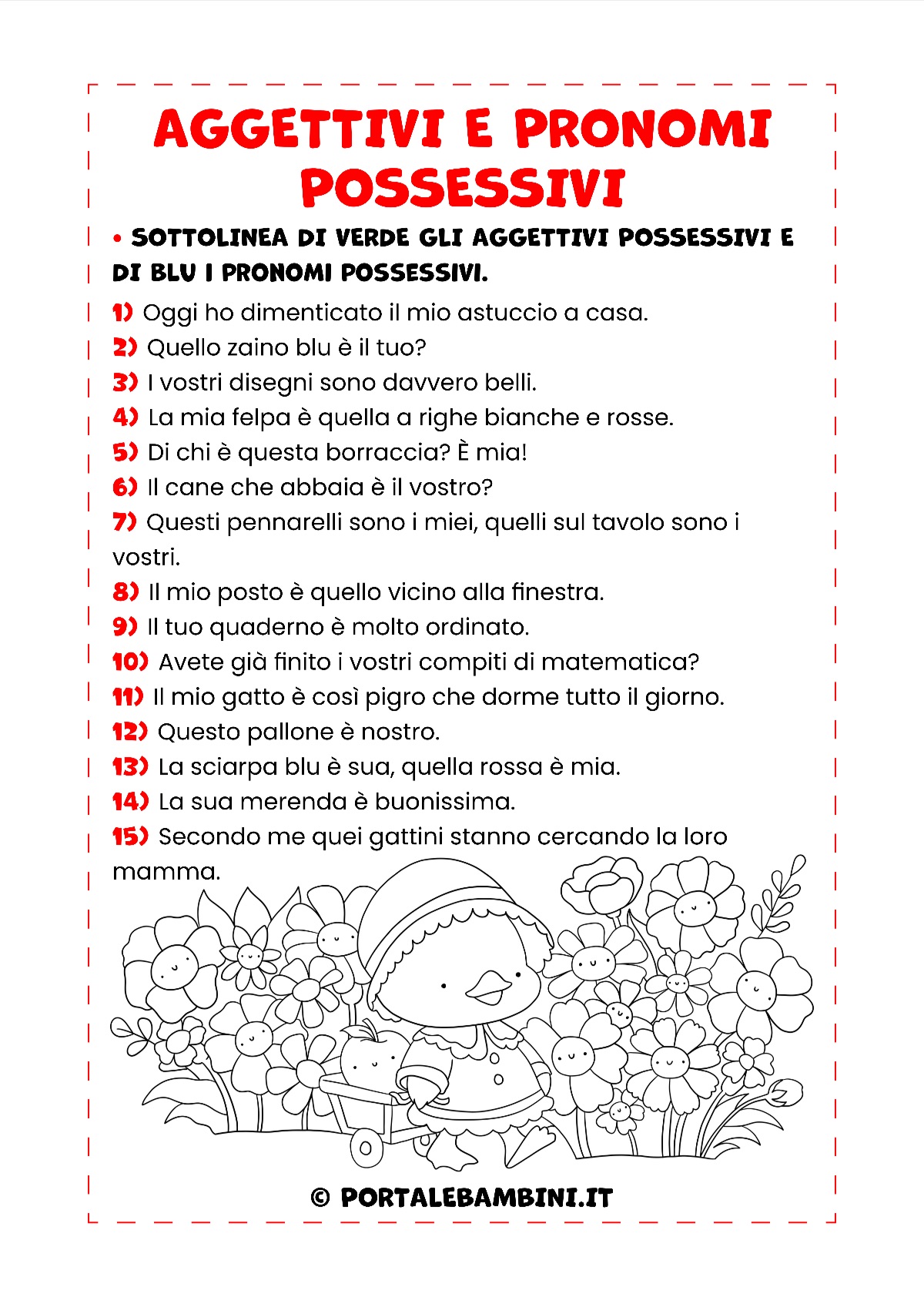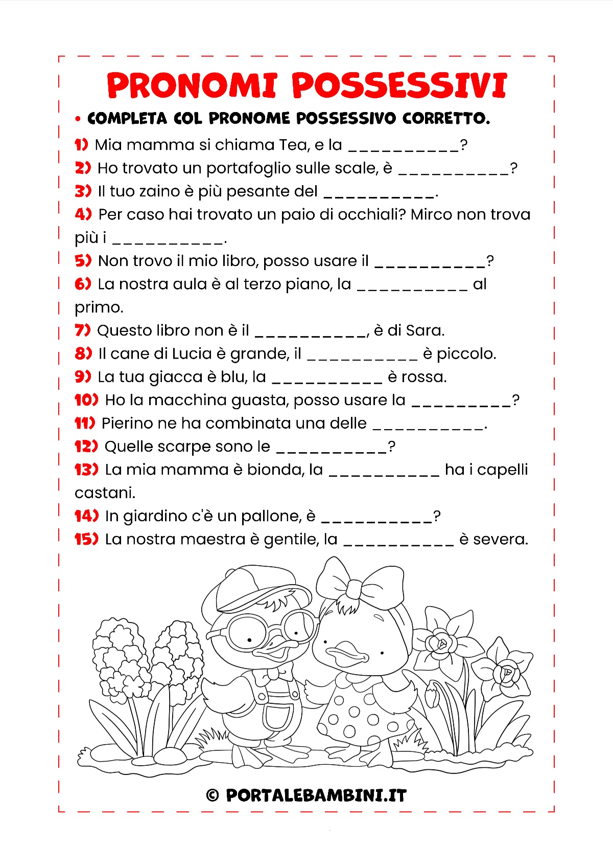 Nella prima scheda i bambini dovranno completare le frasi con il pronome possessivo corretto; nella seconda, invece, dovranno riuscire a discriminare aggettivi e pronomi possessivi.