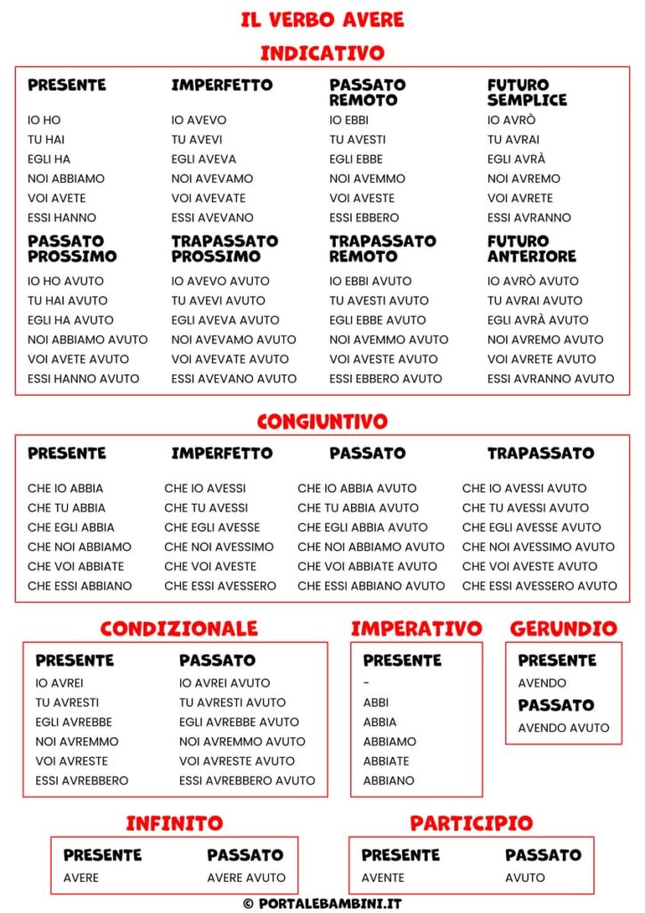 Qui puoi trovare la coniugazione corretta del verbo avere (troverai tutti i tempi e tutti i modi).