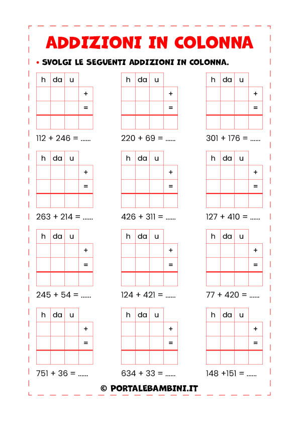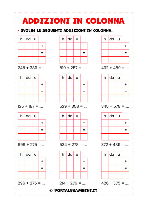 Addizioni in colonna. In questo articolo troverete le nostre schede didattiche per ripassare le addizioni in colonna con e senza il cambio.