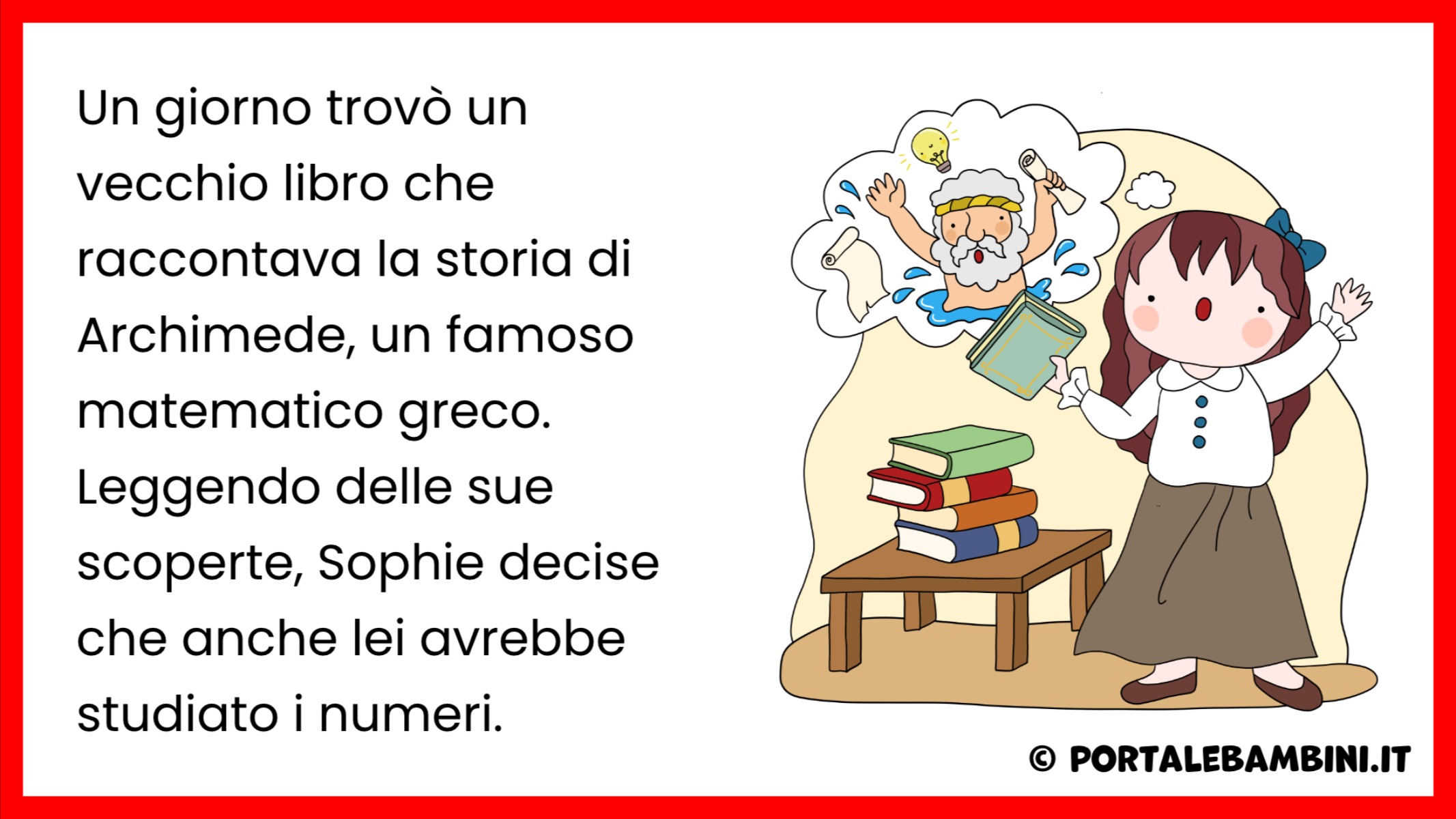 Un giorno trovò un vecchio libro che raccontava la storia di Archimede, un famoso matematico greco. Leggendo delle sue scoperte, Sophie decise che anche lei avrebbe studiato i numeri.
