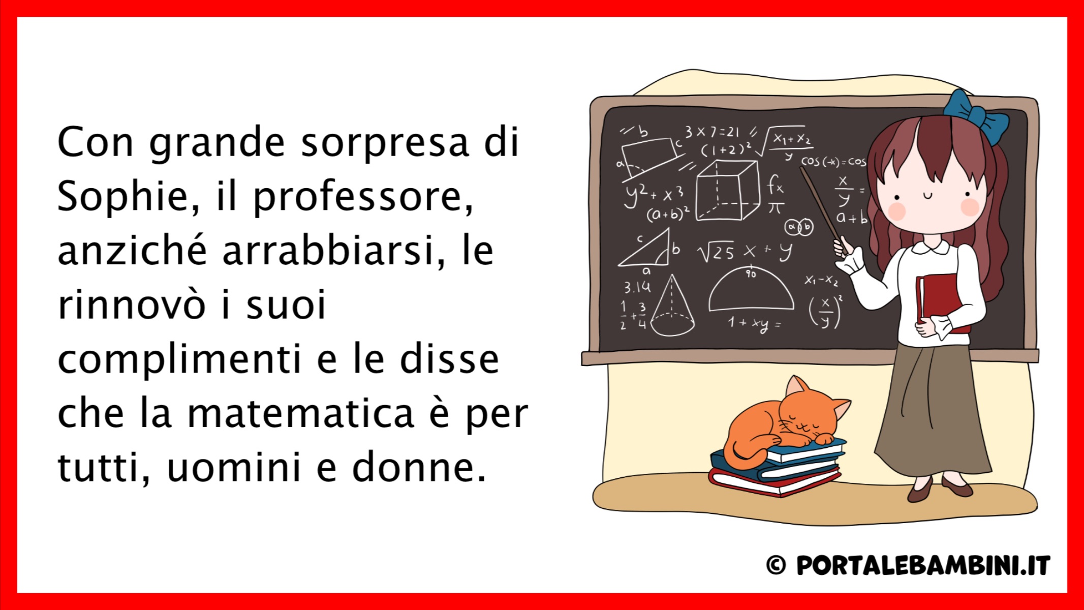 Con grande sorpresa di Sophie, il professore, anziché arrabbiarsi, le rinnovò i suoi complimenti e le disse che la matematica è per tutti, uomini e donne.
